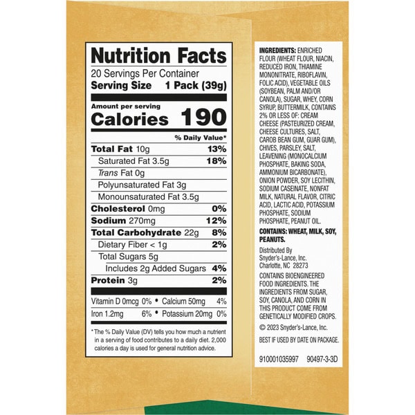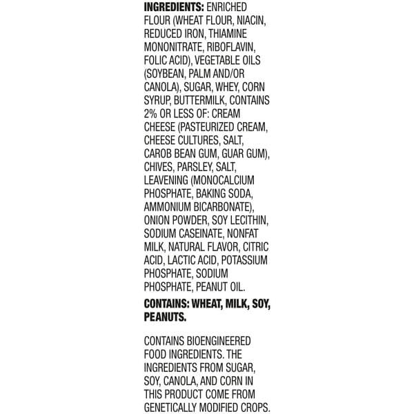 Enriched Flour (wheat Flour, Niacin, Reduced Iron, Thiamine Mononitrate, Riboflavin, Folic Acid), Vegetable Oils (soybean, Palm And/or Canola), Sugar, Whey, Corn Syrup, Buttermilk, Contains 2% Or Less Of: Cream Cheese (pasteurized Cream, Cheese Cultures, Salt, Carob Bean Gum, Guar Gum), Chives, Parsley, Salt, Leavening (monocalcium Phosphate, Baking Soda, Ammonium Bicarbonate), Onion Powder, Soy Lecithin, Sodium Caseinate, Nonfat Milk, Natural Flavor, Citric Acid, Lactic Acid, Potassium Phosphate, Sodium Phosphate, Peanut Oil