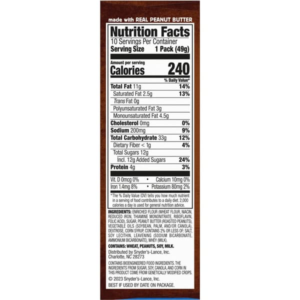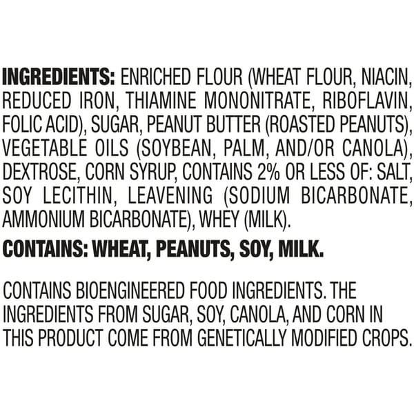 Enriched Flour (wheat Flour, Niacin, Reduced Iron, Thiamine Mononitrate, Riboflavin, Folic Acid), Sugar, Peanut Butter (roasted Peanuts), Vegetable Oils (soybean, Palm, And/or Canola), Dextrose, Corn Syrup, Contains 2% Or Less Of: Salt, Soy Lecithin, Leavening (sodium Bicarbonate, Ammonium Bicarbonate), Whey (milk)