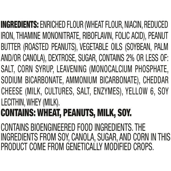 Enriched Flour (wheat Flour, Niacin, Reduced Iron, Thiamine Mononitrate, Riboflavin, Folic Acid), Peanut Butter (roasted Peanuts), Vegetable Oils (soybean, Palm And/or Canola), Dextrose, Sugar, Contains 2% Or Less Of: Salt, Corn Syrup, Leavening (monocalcium Phosphate, Sodium Bicarbonate, Ammonium Bicarbonate), Cheddar Cheese (milk, Cultures, Salt, Enzymes), Yellow 6, Soy Lecithin, Whey (milk)