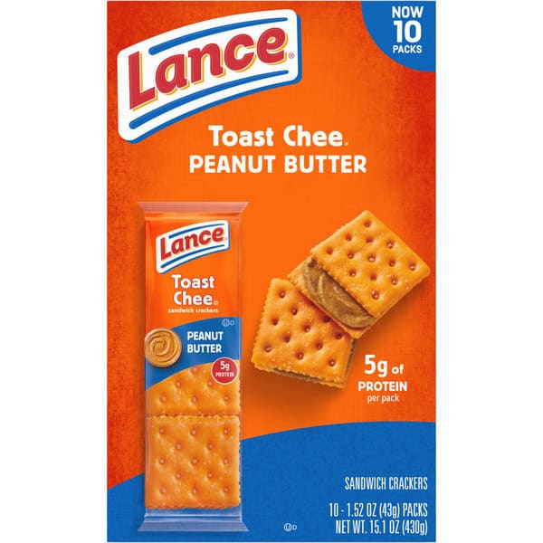 For more than 100 years, Lance has been fueling families with delicious snacks. One favorite is ToastChee Crackers, paired with our irresistible real creamy peanut butter filling. These are a truly iconic sandwich cracker snack! At Lance, sandwiches mean more: they aren’t just two somethings with whatever in the middle. ToastChee Peanut Butter Crackers are our fresh-baked crackers on the paired with real peanut butter filling to create a much-loved and tasty snack. Or, as we say, a Lance Sandwich cracker is two awesomes on the outside with totally incredible in the middle. You get 10 cracker snack packs with 6 sandwich crackers per pack. That means you can enjoy these convenient peanut butter and cracker creations during lunch breaks, for afternoon snacks, or snacking any other time – even on the go. The next time you’re ready to take a moment or need a quick pick-me-up, make it your one and only Lance Sandwich crackers, the king of all sandwich crackers. Bring it!