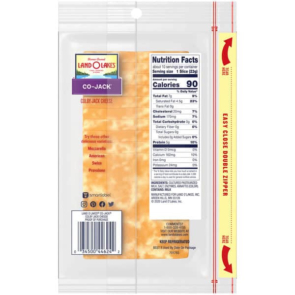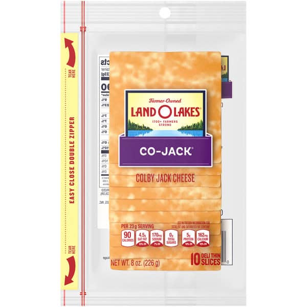 Whether you’re looking for the finishing touch to your cheeseburger or your breakfast sandwich, Colby and Monterey Jack cheese come together in perfect harmony, both in flavor and in color, in Land O Lakes® Co-Jack® Sliced Cheese. Try these other delicious varieties: Mozzarella; American; Swiss; Provolone. Comments? 1-800-328-4155. Visit our website at www.landolakes.com.