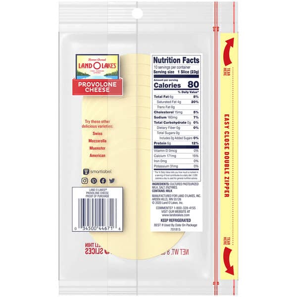 Whether you’re topping bruschetta or our Italian Beef Melt, Land O Lakes® Provolone Sliced Cheese is a great choice for some of your favorite recipes! Pick up your favorite variety of Land O Lakes® cheese at your local deli without the wait of the deli line. Try these other delicious varieties: Mozzarella; American; Swiss; Muenster. Comments? 1-800-328-4155. Visit our website at www.landolakes.com