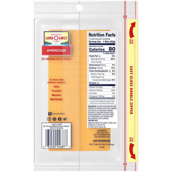 Land O Lakes Yellow Deli American is the staple for lunchtime sandwiches, gooey grilled cheese and juicy burgers. It’s the ultimate sandwich secret weapon. Perfect for a classic ham and cheese sandwich, or as an unexpected addition to the classic BLT, Land O Lakes Packaged Sliced Deli American is Deli American without the line. Yellow Deli American delivers gooey, melty, cheesy perfection to your favorite sandwiches, burgers and wraps. However you slice it, Land O Lakes Deli American is the go-to for lunches, barbeques, and parties. You can enjoy it knowing you are supporting farmer-owners in communities across the country. Contains one 8oz bag of 10 slices.