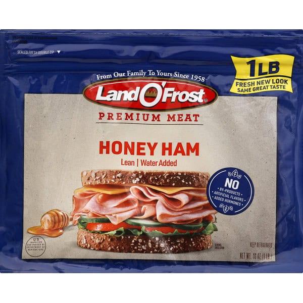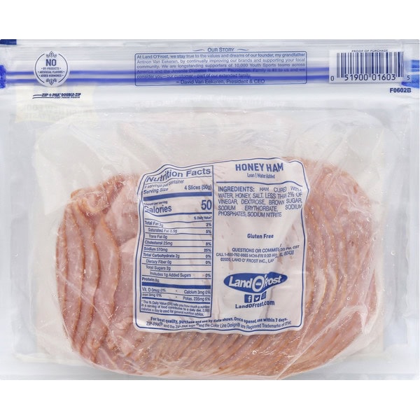 Gluten free. From our family to yours since 1958. Lean. Water added. 1 lb fresh new look same great taste. No by-products. Artificial flavors. Added hormones. Zip pak double-zip. Stay fresh pouch. Our Story: At land O’frost, we stay true the values and dreams of our founder, my grandfather Antoon Van Eekeren, by continually improving our brands and supporting your local community. We are longstanding supporters of 10,000 youth sports teams across America and the Juvenile diabetes research foundation. Family is No. 1 to us and we consider you – our customer – part of our extended family. – David Van Eekeren, President & CEO. Inspected for wholesomeness by US Department of Agriculture. LandOFrost.com. Facebook. Twitter. Instagram. LandOfFrost.com. Questions or comments? Call 1-800-762-9865 Mon-Fri 8:00 am to 4:30 pm, CST.