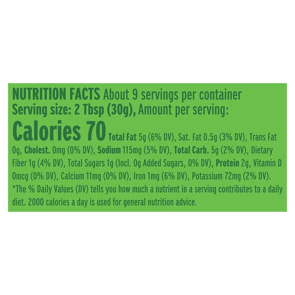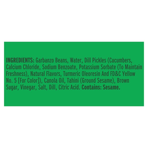 Garbanzo Beans, Water, Avocado, Canola Oil, Tahini (Ground Sesame), Concentrated Lemon Juice, Jalapeños, Onion, Sea Salt, Vinegar, Garlic.