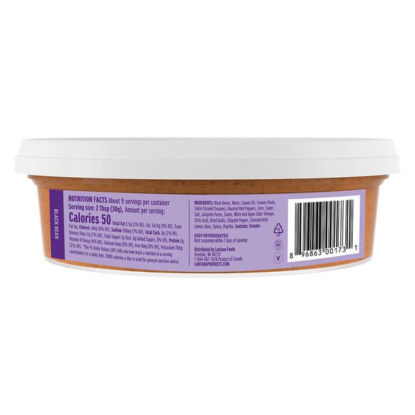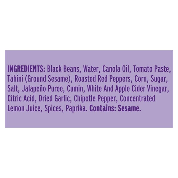 Black Beans, Water, Tomato Paste, Canola and Olive Oil, Tahini (Ground Sesame), Apple Cider Vinegar, Red Peppers, Corn, Garlic, Pineapple, Sugar, Salt, Spices, Vinegar, Chipotle Pepper, Citric Acid, Lime Juice Concentrate, Natural flavor, Dried Garlic, Dehydrated Cilantro, Paprika.