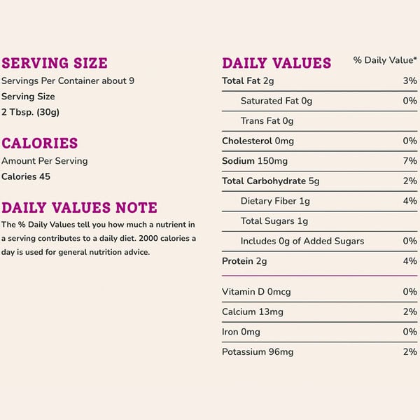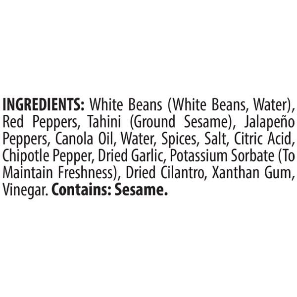 White Beans (White Beans, Water), Water, Red Peppers (Red Peppers, Water, Salt, Citric Acid), Tahini (Ground Sesame), Jalapeño Peppers (Green Jalapeño Peppers, Salt, Vinegar, Natural Flavoring), Salt, Dried Garlic, Chipotle Pepper, Spices, Citric Acid, Cayenne Pepper, Potassium Sorbate (To Maintain Freshness), Dried Cilantro, Guar Gum, Concentrated Lemon Juice.