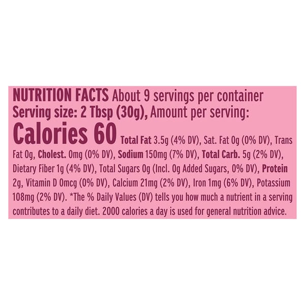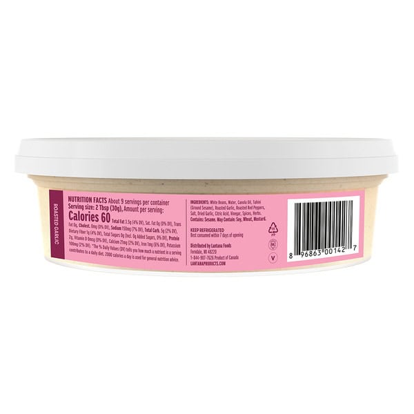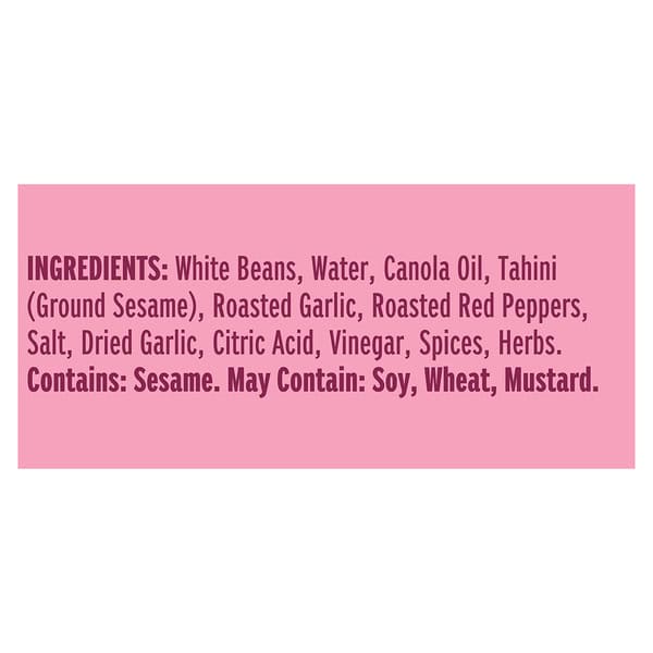 White Beans, Water, Canola and Olive Oil, Tahini (Ground Sesame), Roasted Garlic, Red Peppers, Vinegar, Salt, Citric Acid, Spices, Herbs.