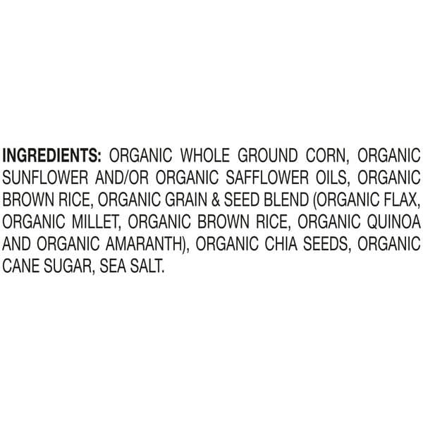 Organic Whole Ground Corn, Organic Sunflower And/or Organic Safflower Oils, Organic Brown Rice, Organic Grain & Seed Blend (organic Flax, Organic Millet, Organic Brown Rice, Organic Quinoa And Organic Amaranth), Organic Chia Seeds, Organic Cane Sugar, Sea Salt.