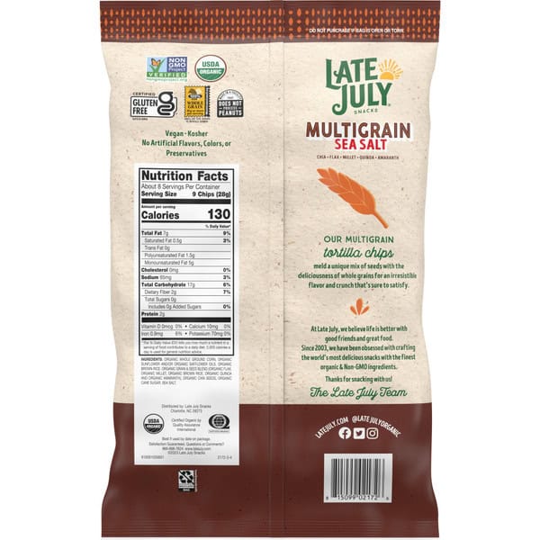 Let the good times roll with Late July Snacks Multigrain Organic Tortilla Chips with Sea Salt. These multigrain tortilla chips are made with a mild mix of seeds, like chia and flax, combined with a flavorful blend of whole grains for an irresistible crunch that’s sure to satisfy. Crafted with organic whole ground corn and perfectly seasoned with sea salt, our corn tortilla chips contain only the finest ingredients, with no artificial flavors or preservatives. In addition to being USDA Certified Organic, they’re also Non-GMO Project Verified, Certified Gluten Free, vegan and kosher. Enjoy these amazingly delicious, gluten free tortilla chips on their own, dip them in salsa, queso or guacamole, or use them to make nachos, taco salad and more. Each 7.5-ounce bag contains 8 servings and is perfect for sharing with friends or snacking alone. At Late July, we believe the best gatherings only need a few simple ingredients: good friends, good stories and great food. For us, that means a big bowl of our tortilla chips and salsa. In addition to Multigrain Sea Salt chips, Late July also offers thin and crispy restaurant style organic chips in a variety of flavors. Late July is the sweet spot of summer. It’s a moment in time when life is simple, pure and good. And Late July tortilla chips take you there, any time of the year! Try Late July organic snacks today.