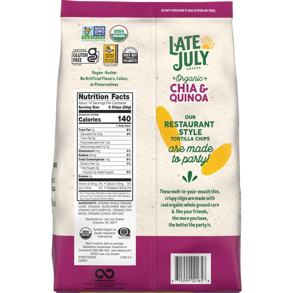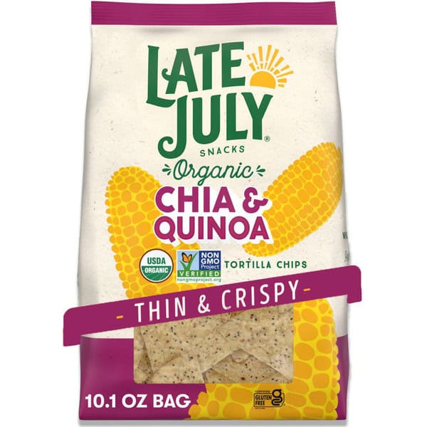 Let the good times roll with Late July Snacks Thin and Crispy Organic Tortilla Chips with Chia and Quinoa. These restaurant style tortilla chips are made to be shared, with a melt-in-your-mouth, thin and crispy texture that’s the perfect complement to authentic salsa. Crafted with organic whole ground corn plus a flavorful blend of chia and quinoa, our corn tortilla chips contain only the finest ingredients, with no artificial flavors, colors or preservatives. In addition to being USDA Certified Organic, they’re also Non-GMO Project Verified, Certified Gluten Free, vegan and kosher. Enjoy these amazingly delicious, gluten free tortilla chips on their own, dip them in salsa, queso or guacamole, or use them to make nachos, taco salad and more. Each 10.1-ounce bag contains 10 servings and is perfect for sharing with friends or snacking alone. At Late July, we believe the best gatherings only need a few simple ingredients: good friends, good stories and great food. For us, that means a big bowl of our thin tortilla chips and salsa. In addition to Chia and Quinoa chips, Late July organic chips are also available in Sea Salt, Jalapeno and Lime, and more. Late July is the sweet spot of summer. It’s a moment in time when life is simple, pure and good. And Late July tortilla chips take you there, any time of the year! Try Late July organic snacks today.