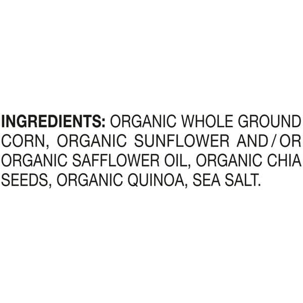 Organic Whole Ground Corn, Organic Sunflower And/or Organic Safflower Oil, Organic Chia Seeds, Organic Quinoa, Sea Salt