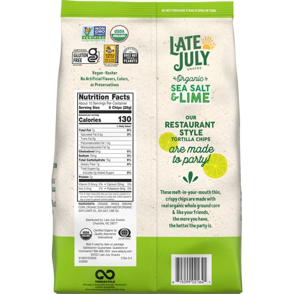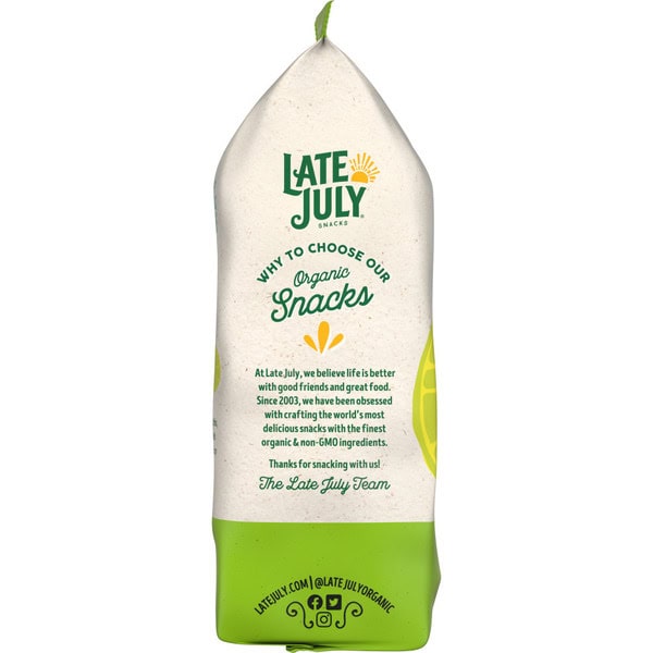 Let the good times roll with Late July Snacks Thin and Crispy Organic Tortilla Chips with Sea Salt and Lime. A refreshing twist on a classic, Late July Sea Salt and Lime Tortilla Chips are made with real lime and perfectly seasoned with sea salt. These restaurant style tortilla chips have a melt-in-your-mouth, thin and crispy texture that’s the perfect complement to authentic salsa. Crafted with organic whole ground corn, our corn tortilla chips contain only the finest ingredients, with no artificial flavors, colors or preservatives. In addition to being USDA Certified Organic, they’re also Non-GMO Project Verified, Certified Gluten Free, vegan and kosher. Enjoy these amazingly delicious, gluten free tortilla chips on their own, dip them in salsa, queso or guacamole, or use them to make nachos, taco salad and more. Each 10.1-ounce bag contains 10 servings and is perfect for sharing with friends or snacking alone. At Late July, we believe the best gatherings only need a few simple ingredients: good friends, good stories and great food. For us, that means a big bowl of our thin tortilla chips and salsa. In addition to Sea Salt and Lime, Late July organic chips are also available in Sea Salt, Chia and Quinoa, and more. Late July is the sweet spot of summer. It’s a moment in time when life is simple, pure and good. And Late July tortilla chips take you there, any time of the year! Try Late July organic snacks today.