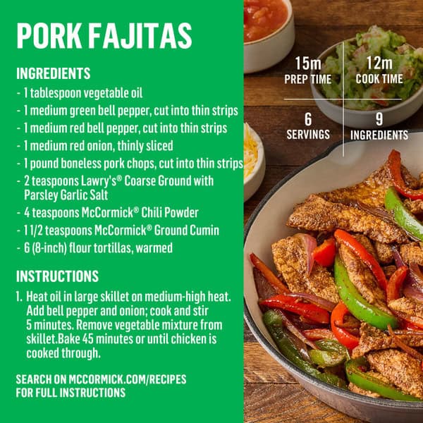 Lawry’s Coarse Ground with Parsley Garlic Salt is the salt you want in your pantry to add zing to your favorite recipes. A blend of coarse-ground garlic, salt, and parsley in one convenient bottle, it adds full-bodied garlic flavor to mac ‘n cheese, rice and beans, tacos, greens … everything!