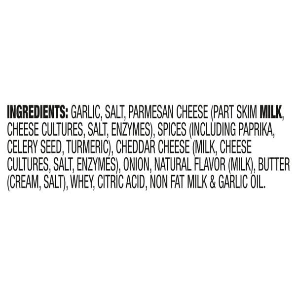 Garlic, Salt, Parmesan Cheese (part Skim Milk, Cheese Cultures, Salt, Enzymes), Spices (including Paprika, Celery Seed, Turmeric), Cheddar Cheese (milk, Cheese Cultures, Salt, Enzymes), Onion, Natural Flavor (milk), Butter Cream, Salt), Whey, Citric Acid, Non Fat Milk & Garlic Oil.