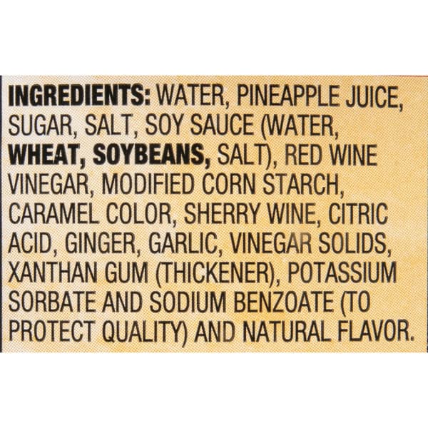 Water, Pineapple Juice, Sugar, Salt, Soy Sauce (water, Wheat, Soybeans, Salt), Red Wine Vinegar, Modified Corn Starch, Caramel Color, Sherry Wine, Citric Acid, Ginger, Garlic, Vinegar Solids, Xanthan Gum (thickener), Potassium Sorbate, Sodium Benzoate (to Protect Quality), Natural Flavor