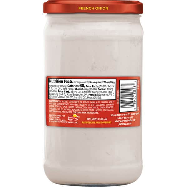 Water, Sunflower Oil And/or Canola Oil, Onions, Whey Protein Concentrate, And Less Than 2% Of The Following: Modified Corn Starch, Salt, Sugar, Monosodium Glutamate, Onion Powder, Caramel Color, Natural Flavors, Glucono Delta Lactone, Lactic Acid, Xanthan Gum, And Datem.