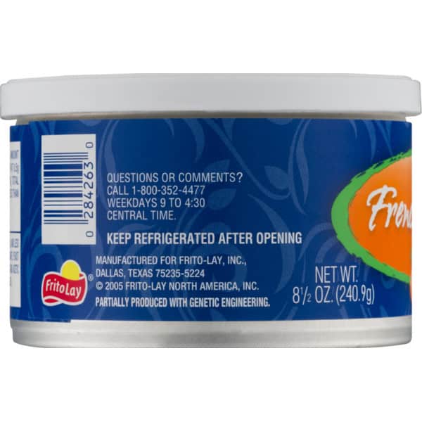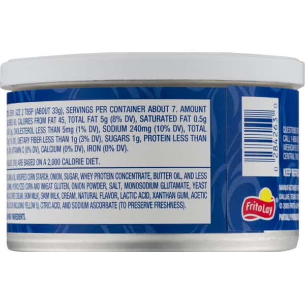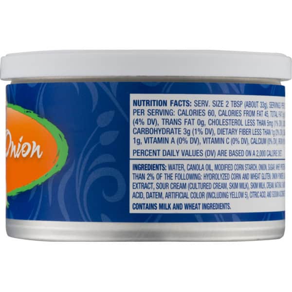 Water, Canola Oil, Modified Corn Starch, Onion, Sugar, Whey Protein Concentrate, Butter Oil, And Less Than 2% Of The Following: Hydrolyzed Corn And Wheat Gluten, Onion Powder, Salt, Monosodium Glutamate, Yeast Extract, Sour Cream (cultured Cream, Skim Milk), Skim Milk, Cream, Natural Flavor, Lactic Acid, Xanthan Gum, Acetic Acid, Datem, Mono And Di-glycerides, Artificial Color (yellow 5), Citric Acid, And Sodium Ascorbate (to Preserve Freshness).