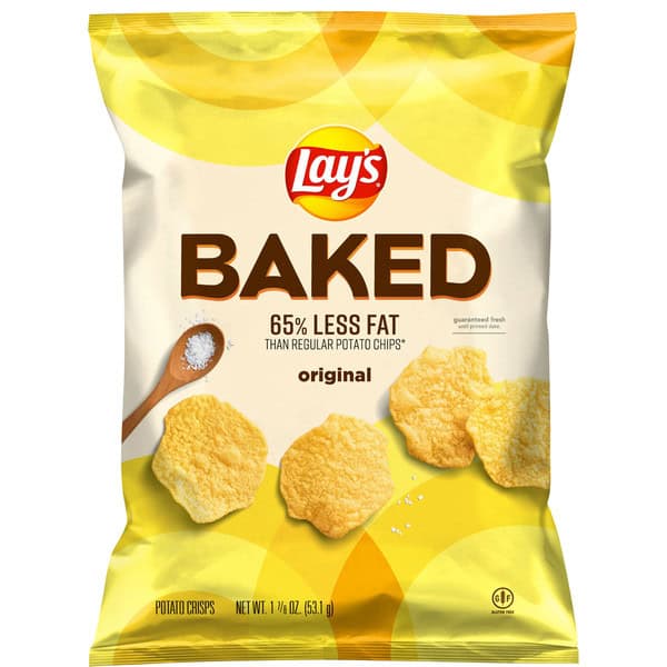 Frito-Lay’s line of Oven Baked snacks are baked, not fried, to give you the great taste you’ve come to love with Frito-Lay snacks. On top of that, LAY’S Oven Baked Original Potato Crisps 80% less fat than regular potato chips. Fat content of regular potato chips is 10g per 1 oz serving. Fat content for these snacks is 2g per 1 oz serving. Each package contains 1.875 oz.