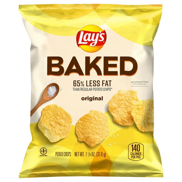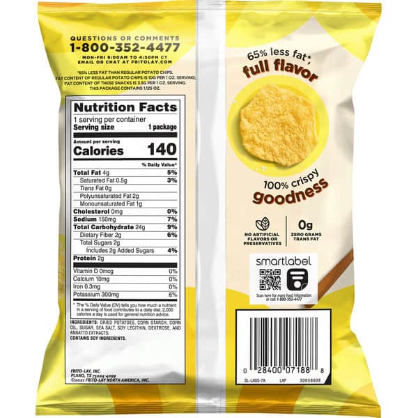 No artificial flavors or preservatives. 140 calories per pkg. 0 g zero grams trans fat. Gluten free. 65% less fat than regular potato chips (65% less fat than regular potato chips fat content of regular potato chips is 10 g per 1 oz. serving; fat content of these snacks is 3.5 g per 1 oz serving. This pack contains 1.125 oz). No artificial preservatives. 100% crispy goodness. fritolay.com. SmartLabel: Scan for more food information or call 1-800-352-4477. Questions or Comments? 1-800-352-4477 Mon-Fri 9:00 am to 4:30 pm CT email or chat at fritolay.com.