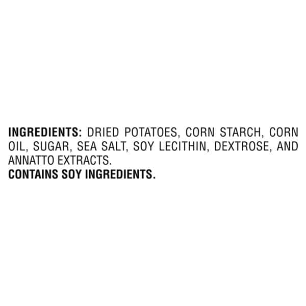Dried Potatoes, Corn Starch, Corn Oil, Sugar, Sea Salt, Soy Lecithin, Dextrose, And Annatto Extracts. Contains Soy Ingredients.