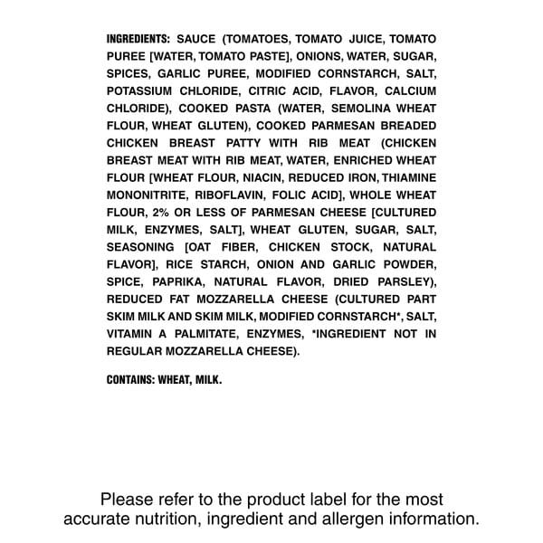 Cooked Pasta (water, Semolina Wheat Flour, Wheat Gluten), Tomatoes, Cooked Parmesan Breaded Chicken Breast Patty With Rib Meat (chicken Breast Meat With Rib Meat, Water, Enriched Wheat Flour [wheat Flour, Niacin, Reduced Iron, Thiamine Mononitrite, Riboflavin, Folic Acid], Whole Wheat Flour, 2% Or Less Of Parmesan Cheese [cultured Milk, Enzymes, Salt], Wheat Gluten, Sugar, Salt, Seasoning [oat Fiber, Chicken Stock, Natural Flavor], Rice Starch, Onion Powder, Garlic Powder, Spice, Paprika, Natural Flavor, Dried Parsley), Tomato Juice, Water, Tomato Paste, Part-skim Mozzarella Cheese And Modified Cornstarch (part-skim Mozzarella Cheese [cultured Milk, Salt, Enzymes], Modified Cornstarch, Skim Milk, Flavors), Onions, 2% Or Less Of Parmesan Cheese (cultured Milk, Salt, Enzymes), Sugar, Spices, Garlic, Modified Cornstarch, Salt, Potassium Salt, Citric Acid, Onion Powder, Calcium Chloride