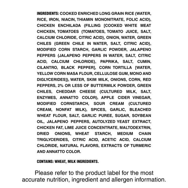 Cooked Enriched Long Grain Rice (water, Rice, Iron, Niacin, Thiamin Mononitrate, Folic Acid), Chicken Enchilada (corn Tortilla [corn Masa {corn Flour, Cellulose Gum, Mono- And Diglycerides, Trace Of Lime}, Water], Cooked Chicken Meat [chicken, Carrageenan], Tomatoes [tomatoes, Tomato Juice, Salt, Calcium Chloride, Citric Acid], Onions, Water, Green Chiles [green Chiles, Citric Acid, Salt, Calcium Chloride], Modified Cornstarch, Garlic Powder, Jalapeno Peppers [jalapeno Peppers, Water, Salt, Acetic Acid, Calcium Chloride], Paprika, Spices, Salt, Cilantro), Water, Skim Milk, Onions, Corn, Red Peppers, 2% Or Less Of Buttermilk Powder, Green Chiles, Cheddar Cheese (cultured Milk, Salt, Enzymes, Annatto Color), Apple Cider Vinegar, Modified Cornstarch, Sour Cream (cultured Cream, Skim Milk), Spices, Garlic, Bleached Wheat Flour, Salt, Garlic Puree, Sugar, Soybean Oil, Jalapeno Peppers, Autolyzed Yeast Extract, Chicken Fat, Lime Juice Concentrate, Maltodextrin, Dried Onions, Wheat Starch, Medium Chain Triglycerides, Citric Acid, Acetic Acid, Calcium Chloride, Natural Flavors, Extracts Of Turmeric And Annatto Color