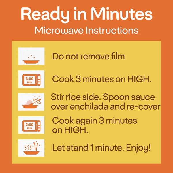 For food safety and quality, follow these cooking instructions (Microwave Oven – 1100 Watts): Prep: Do not remove film. Cook 3 minutes on high. Stir rice side spoon sauce over enchilada and re-cover. Cook again 3 minutes on high. Let stand 1 minute & enjoy. Cook thoroughly. Will be hot! Ensure product reaches an internal temperature of 165 degrees F. Do not prepare in conventional or toaster ovens. Do not reheat tray.