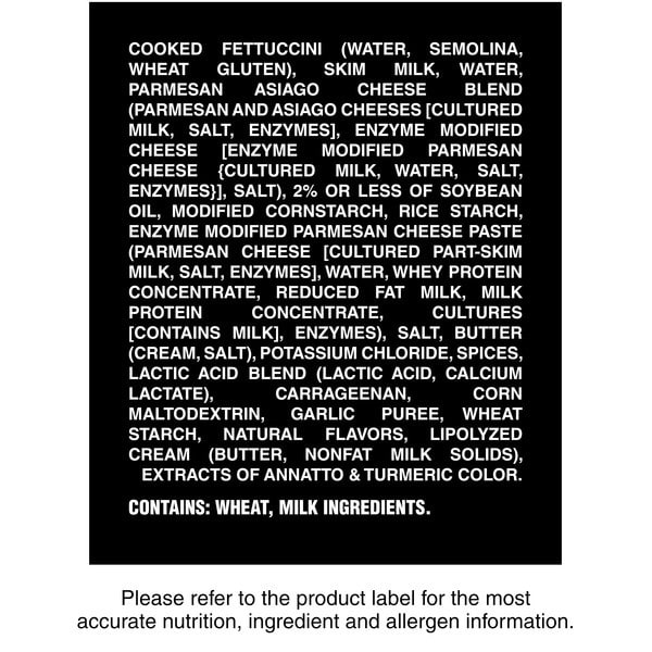 Cooked Fettuccini: Water, Semolina, Soybean Oil, Wheat Gluten, Sauce: Skim Milk, Water, Parmesan Asiago Cheese Blend (parmesan And Asiago Cheeses [cultured Milk, Salt, Enzymes], Flavor [enzyme Modified Parmesan Cheese {cultured Milk, Water, Salt, Enzymes}], Salt), Modified Cornstarch, Rice Starch, Enzyme Modified Parmesan Cheese Paste (parmesan Cheese [cultured Part-skim Milk, Salt, Enzymes], Water, Whey Protein Concentrate, Skim Milk, Milk Protein Concentrate, Milk Cultures, Enzymes), Salt, Butter (cream, Salt), Potassium Chloride, Yeast Extract, Spices, Lactic Acid Blend (lactic Acid, Calcium Lactate), Carrageenan, Corn Maltodextrin, Garlic Puree, Wheat Starch, Natural Flavors, Lipolyzed Cream (butter, Nonfat Milk Solids), Extracts Of Annatto And Turmeric Color