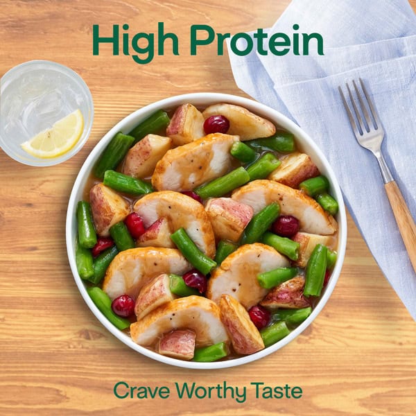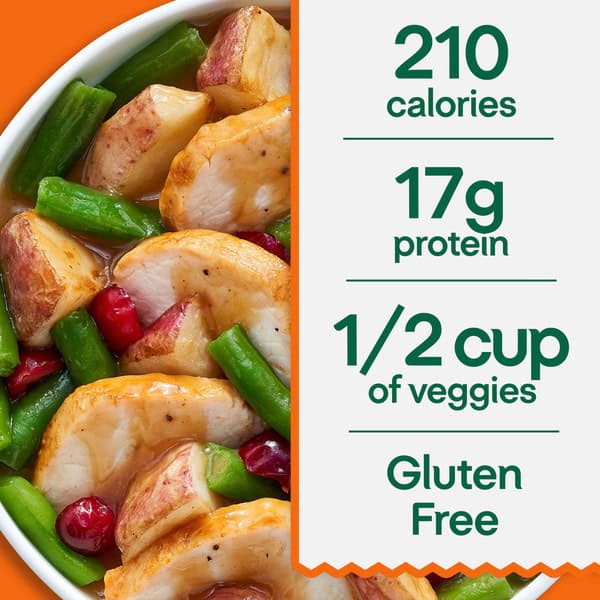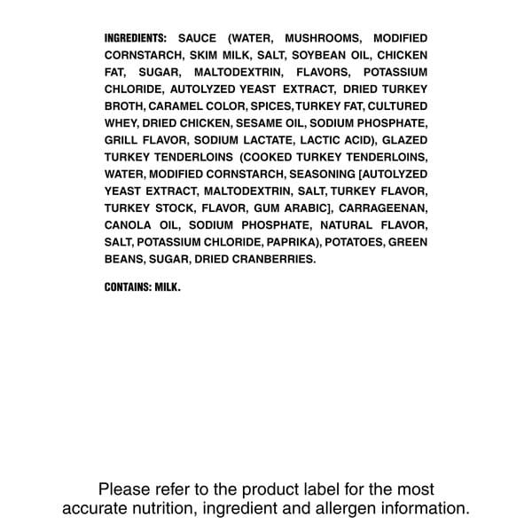 Sweet Potatoes, Glazed Turkey Tenderloins (cooked Turkey Tenderloins, Water, Modified Cornstarch, Seasoning [autolyzed Yeast Extract, Maltodextrin, Salt, Turkey Flavor, Turkey Stock, Flavor, Gum Arabic], Carrageenan, Canola Oil, Sodium Phosphate, Natural Flavoring, Salt, Potassium Chloride, Paprika), Green Beans, Water, Sweetened Dried Cranberries (cranberries, Sugar), Chicken Broth, 2% Or Less Of Olive Oil, Orange Juice Concentrate, Modified Cornstarch, Dark Balsamic Vinegar, Salt, Orange Blend (orange Peel, Sugar, Orange Oil), Spices