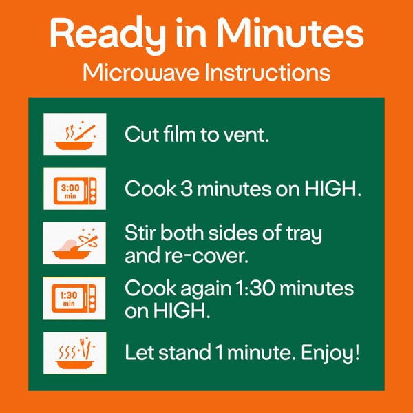 For food safety & quality, follow these cooking instructions: Microwave oven only (1100 Watts): Prep: Cut film o vent. Cook 3 minutes on high. Stir and re-cover. Cook again 1:30 minutes on high. Let stand 1 minute & enjoy. Cook thoroughly. Will be hot! Ensure product reaches an internal temperature of 165 degrees F. Directions developed using 1100 watt microwave oven ovens vary; cooking time may need adjusting. Do not prepare in toaster ovens. Do not reheat bowl.
