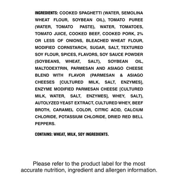 Cooked Spaghetti (water, Semolina Wheat Flour, Soybean Oil), Water, Tomatoes, Tomato Paste, Tomato Juice, Cooked Beef, Cooked Pork, 2% Or Less Of Onions, Bleached Wheat Flour, Modified Cornstarch, Sugar, Salt, Textured Soy Flour, Spices, Dried Soy Sauce (soybean, Wheat, Salt), Onion Powder, Dried Garlic, Soybean Oil, Parmesan And Asiago Cheese Blend With Flavor (parmesan & Asiago Cheeses [cultured Milk, Salt, Enzymes], Enzyme Modified Parmesan Cheese [cultured Milk, Water, Salt, Enzymes], Whey, Salt), Beef Broth, Autolyzed Yeast Extract, Caramel Color, Citric Acid, Calcium Chloride, Potassium Salt, Red Bell Pepper Flakes
