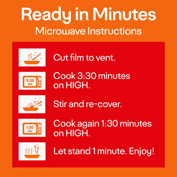For food & safety & quality, follow these cooking instructions. Microwave Ovens Only (1100 Watts): Prep: cut film to vent. Cook: 3:30 minutes on high. Stir and re-cover. Cook again 1:30 minutes on high. Let stand 1 minute & enjoy. Cook thoroughly. Will be hot! Ensure product reaches an internal temperature of 165 degrees F. Directions developed using 1100 watt microwave oven. Ovens vary; cooking time may need adjusting. Do not prepare in toaster ovens. Do not reheat tray.