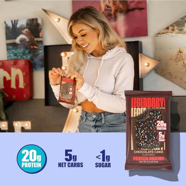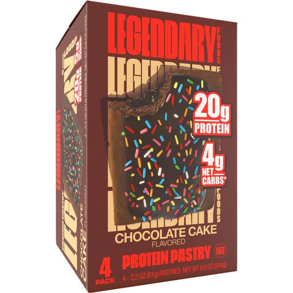 • Box contains 4 individually wrapped Legendary Foods Chocolate Cake Protein Pastries