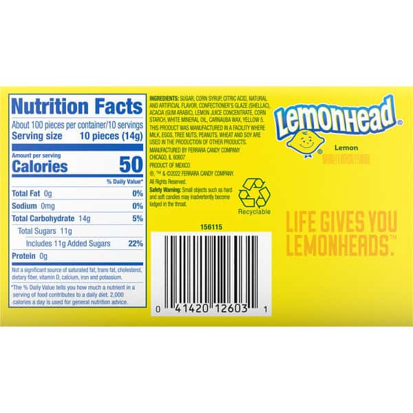 Round & lemony-good, with a hard candy core inside a soft shell, Lemonheads are the original lemon candy, made with real lemon juice. Taste the power of sour with Lemonheads. They are perfect for parties or special events—use them as decorations & party favors. These fantastic sweet & sour candies will be gone before you know it.