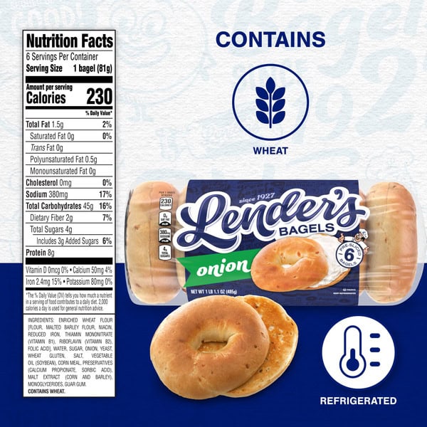 Since 1927, Lender’s has made bagels the authentic way; boiled then hearth baked. Perfectly crisp and golden on the outside, with a soft, tender inside. Lender’s Onion Bagels have that fresh bagel shop taste and are the perfect size; not too big, not too small. They are conveniently chilled for freshness in the dairy case or freezer aisle. 6 bagels per pack allow everyone in your family to enjoy them, and since they’re pre-sliced, preparing is faster, and cleanup is easier.