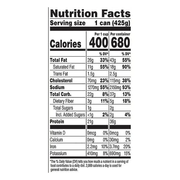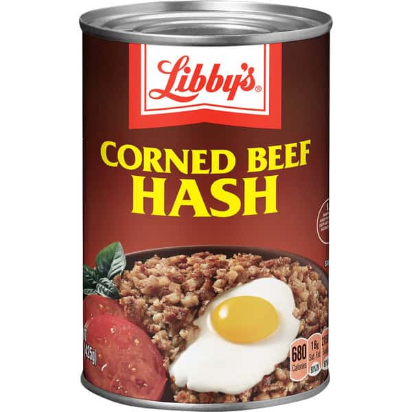 Per 1 Can: 680 calories; 18 g sat fat (90% DV); 2150 mg sodium (93% DV); 2 g total sugars. Libby’s Corned Beef Hash is specially prepared with beef, chopped potatoes and savory seasoning for a truly homemade taste. Great alone, with eggs or in a recipe! US inspected and passed by Department of Agriculture. www.conagrabrands.com. how2recycle.info. SmartLabel: Scan for more food information. Questions or comments, visit us at www.conagrabrands.com or call Mon-Fri., 1-800-727-5777 (except national holidays). Please have entire package available when you call so we may gather information off the label.