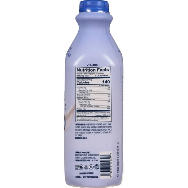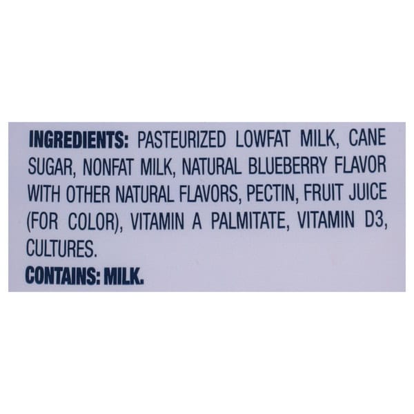 Pasteurized Lowfat Milk, Nonfat Milk, Cane Sugar, Pectin, Natural Blueberry Flavor, Natural Flavors, Grape Juice (for Color), Vitamin A Palmitate, Vitamin D3, Live And Active Cultures
