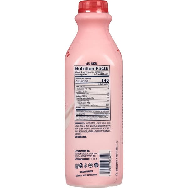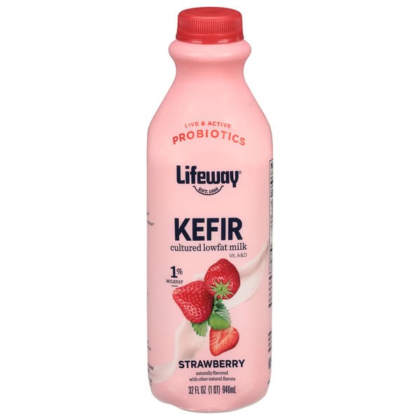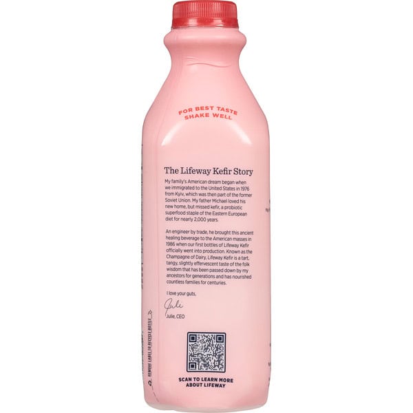Live & active probiotics. Est. 1986. Lactose intolerance friendly. What is Kefir? Kefir, known as the Champagne of Dairy, has been enjoyed for over 2000 years. The probiotic cultures found in this bottle may help support immunity and healthy digestion and have contributed to the extensive folklore surrounding this beverage. Referred to in ancient texts, kefir is more than a probiotic superfood; kefir is a storied historic artifact. The Lifeway Story: Since crafting the first batches of our Lifeway Kefir in 1986, we’ve been dedicated to producing the best tasting kefir and highest quality probiotic products. Today, we’re proudly living the American Dream and are excited to share the wonders of kefir and the joys of good health with your family. -The Smolyansky Family. Healthy Made Easy: Lactose intolerance friendly. May support a healthy immune system (as part of a balanced and healthy diet). May promote a balanced and diverse microbiome (as part of a balanced and healthy diet). 25-30 billion CFU (at time of manufacture). We use milk that has not been treated with artificial hormones (No significant difference has been shown between milk derived from rBST treated cows and non-rBST treated cows). Remove label to recycle bottle.