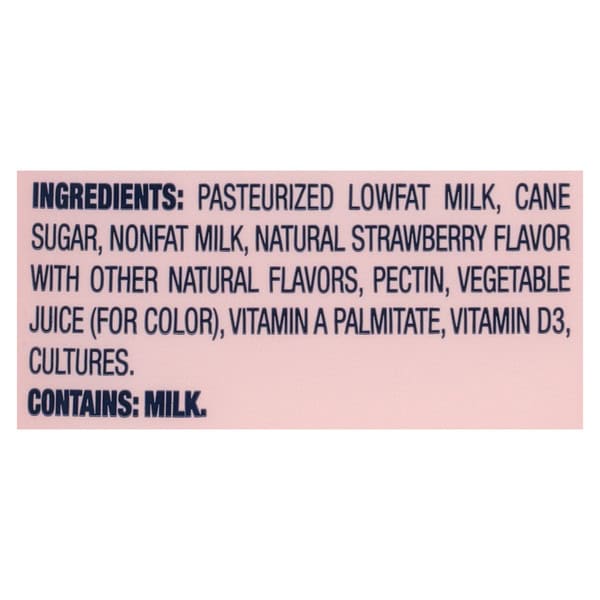 Pasteurized Lowfat Milk, Nonfat Milk, Cane Sugar, Pectin, Natural Strawberry Flavor, Natural Flavors, Red Beet Juice (for Color), Vitamin A Palmitate, Vitamin D3, Live And Active Cultures