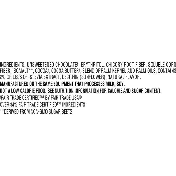 Unsweetened Chocolate‡, Erythritol, Chicory Root Fiber, Soluble Corn Fiber, Isomalt**, Cocoa‡, Cocoa Butter‡, Blend Of Palm Kernel And Palm Oils, Contains 2% Or Less Of: Stevia Extract, Lecithin (sunflower), Natural Flavor. ‡fair Trade Certified By Fair Trade Usa Over 34% Fair Trade Certified Ingredients **derived From Non-gmo Sugar Beets