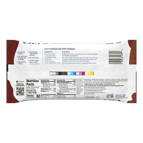 • With a convenient size that perfectly suits most recipes, this 9-ounce bag of LILY’S Dark Chocolate Style baking chips will complete almost any homemade confection