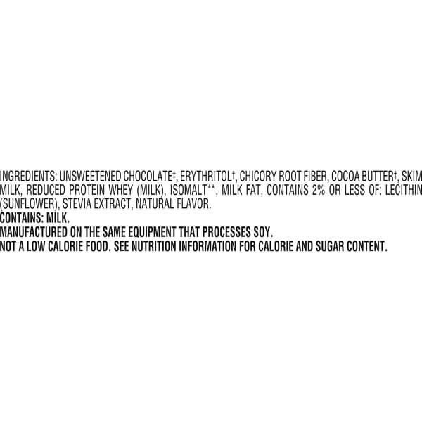 Unsweetened Chocolate‡, Erythritol†, Chicory Root Fiber, Cocoa Butter‡, Skim Milk, Reduced Protein Whey (milk), Isomalt**, Milk Fat, Contains 2% Or Less Of: Lecithin (sunflower), Stevia Extract, Natural Flavor, ‡fair Trade Certified™ By Fair Trade Usa® Over 34% Fair Trade Certified™ Ingredients, †non-gmo, **derived From Non-gmo Sugar Beets