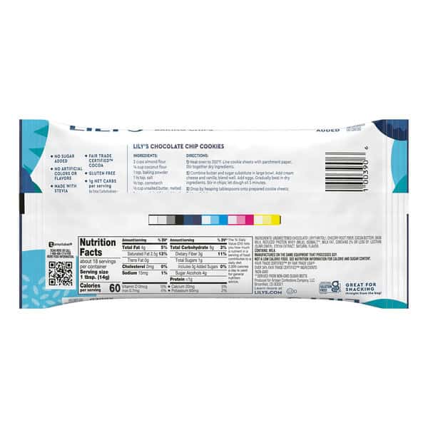 • Contains one (1) 9-ounce bag of LILY’S Milk Chocolate Style No Sugar Added Baking Chips