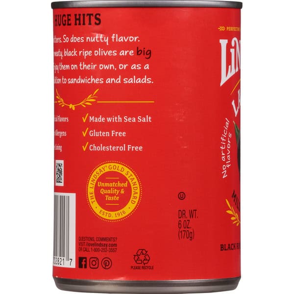Perfecting for four generations. Mild & nutty. Huge Hits: Size matters. So does nutty flavor. And these meaty, black ripe olives are big in both. Enjoy them on their own, or as a savory addition to sandwiches and salads. Unmatched Quality & Taste: The Lindsay gold standard. Estd. 1916. Olives contain naturally occuring oil which may appear on the fruit or the brine. Please recycle.