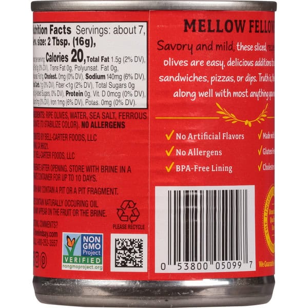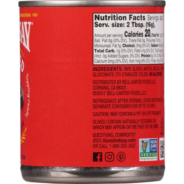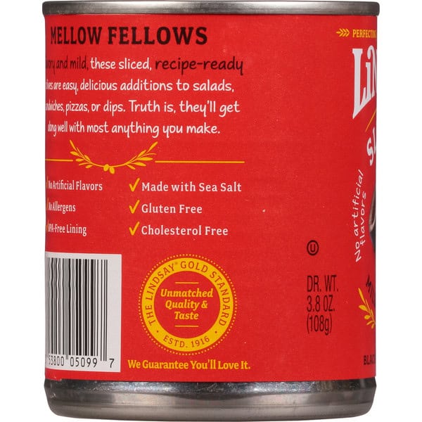 Perfecting for four generations. Topping-ready. Mellow Fellow: Savory and mild, these sliced, recipe-ready olives are easy, delicious additions to salads, sandwiches, pizzas, or dips. Truth is, they’ll get along well with most anything you make. No allergens. Unmatched quality & taste. The Lindsay gold standard. Estd. 1916. Olives contain naturally occurring oil which may appear on the fruit or the brine.