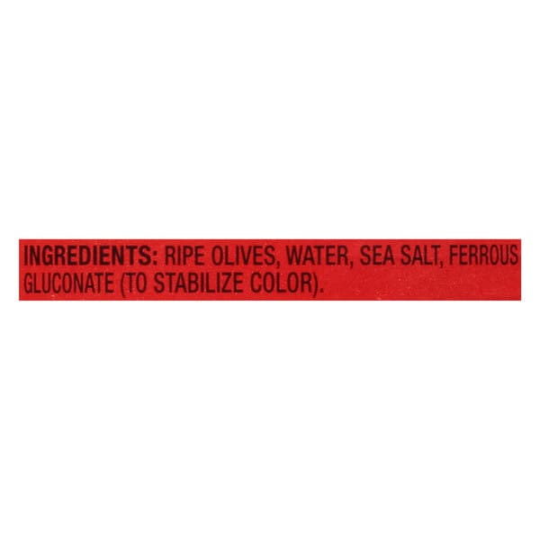 Ingredients: Ripe Olives, Water, Sea Salt, Ferrous Gluconate (to Stabilize Color).