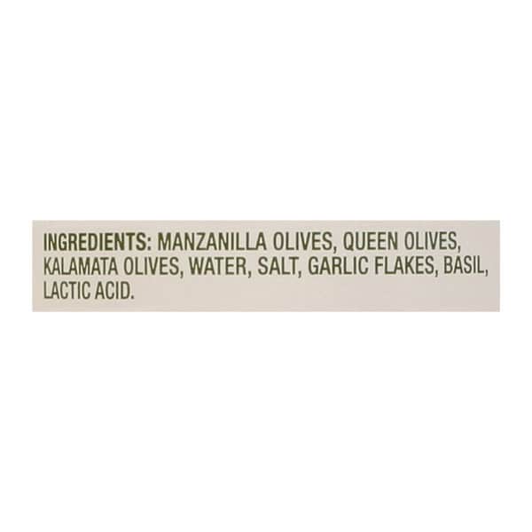 Manzanilla Olives, Queen Olives, Kalamata Olives, Water, Salt, Garlic Flakes, Basil, Lactic Acid.