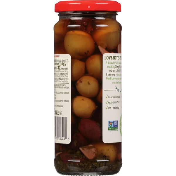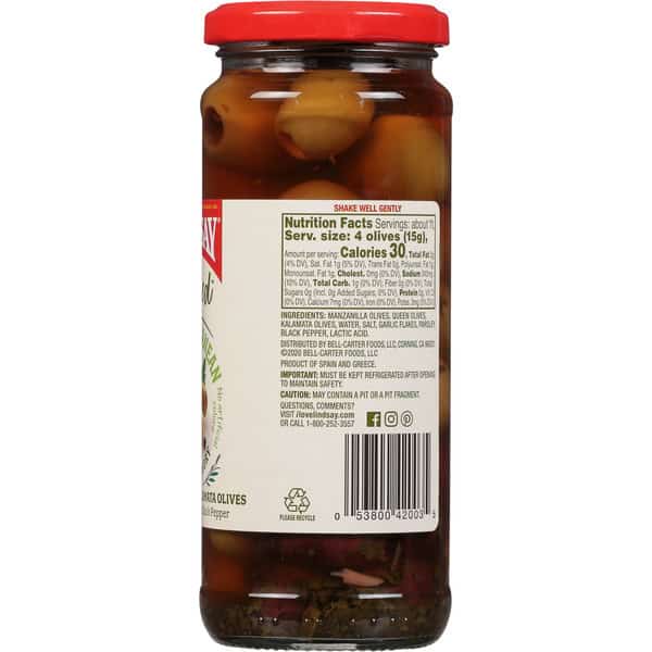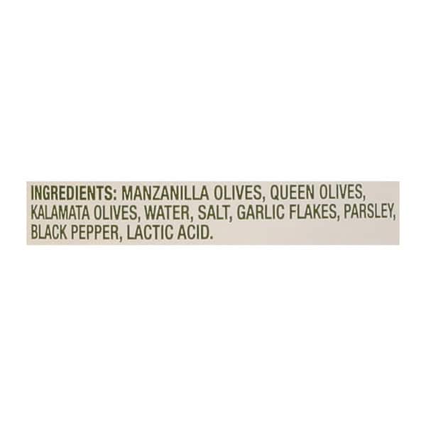 Manzanilla Olives, Queen Olives, Kalamata Olives, Water, Salt, Garlic Flakes, Parsley, Black Pepper, Lactic Acid.