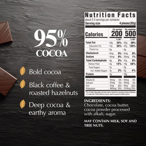 Dive into the refined richness of a Lindt EXCELLENCE 95% Cocoa Dark Chocolate Bar with all your senses. This full-bodied dark chocolate bar features a deep, dark color and attractive aroma with well-balanced cocoa notes that are robust, but not too intense, with an exceptionally silky feel. The sophisticated flavors in this dark chocolate candy bar make this gourmet chocolate the perfect pairing with cabernet sauvignon. Give a dark chocolate candy bar to your favorite chocolate connoisseur, or use them as baking chocolate for intense cocoa flavor in your desserts. This Lindt dark chocolate bar comes portioned into bite size squares, ensuring balanced complexity in each bite. Lindt chocolate is masterfully crafted using the highest-quality ingredients from world-renowned regions, embodying the passion and craftsmanship of Lindt Master Chocolatiers. *Information online not complete; check label of actual product being purchased.*